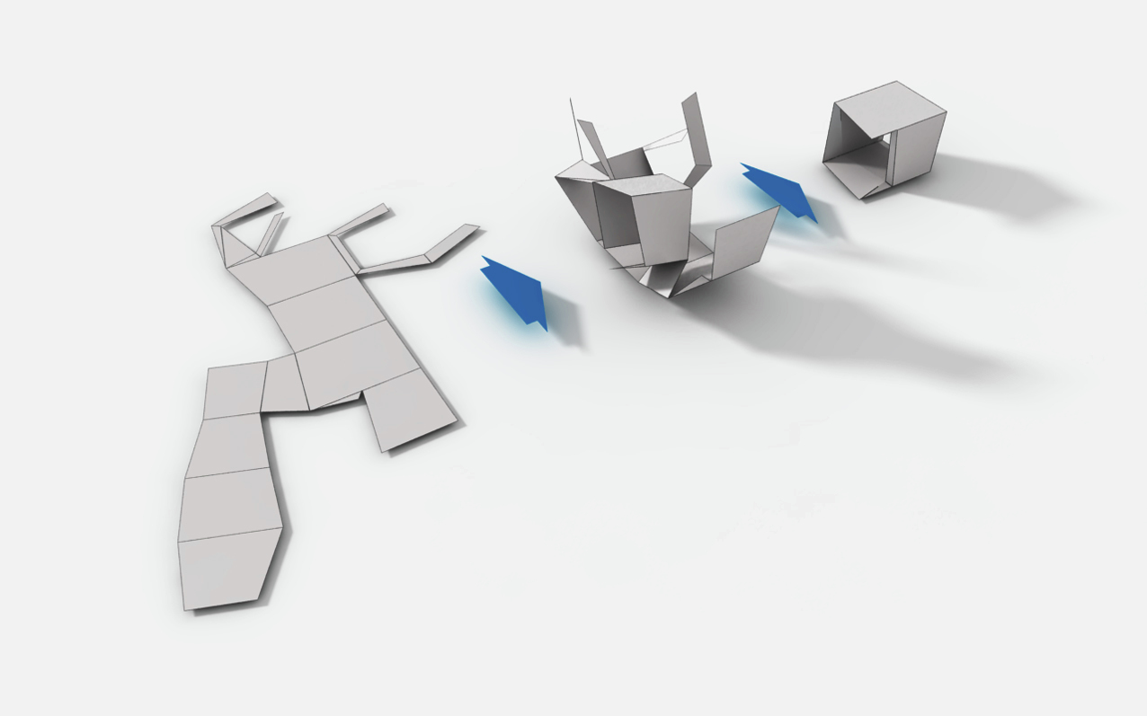 The module is a folded trunk, that has transparent and solid sides, they have differences in height, and the solid parts of the trunk is always has a certain thickness. In these areas, there is space for wiring and for other services, but also it strengthens the structure. The transparent parts of the trunk can be opened.