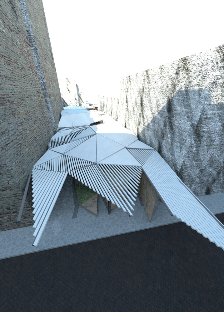 For markets there is a great need for logic and system. But also, traditional markets seem random, muddled. We created a raster, that is more like the base of the modular system, then distorted this raster, as the net of the city is distorted as well. We created 5 ‘trunks ‘, or modules, they have different heights and areas. This way it creates the mood of a re-scaled urban street silhouette. Each trunk can be used as desired, can be rotated, revolved, mirrored, according to the raster, therefore can be adopted to any site.